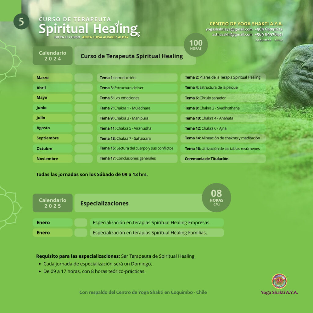 | Requisitos | Tener el certificado del Curso de Terapeuta Spiritual Healing. Pasar la evaluación con nota mínima 7.0 y el 100% de horas de prácticas. |