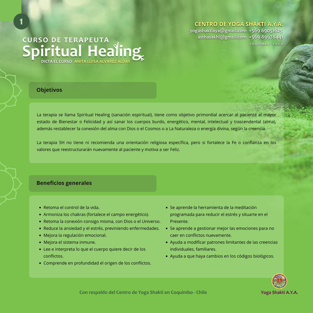 | Valor | $50.000 por mes + matrícula de $35.000, con entrega de material de apoyo escrito y grabación de clase. Diploma de título y credencial con código QR de terapeuta Spiritual Healing. |